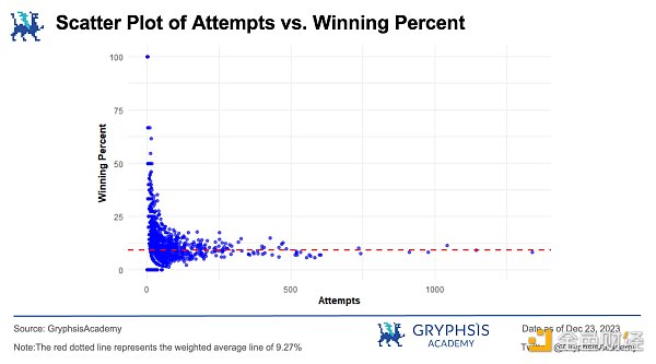从这张图中我们可以看出,在 Analysoor 的 Fair Launch 模型下,随着尝试次数的增加,获胜百分比的分布仍然是相对平坦的,并没有出现显著提高。相反,“幸运儿”往往出现在低尝试次数的参与者当中,尝试次数越多,其胜率越会趋近于加权平均胜率。