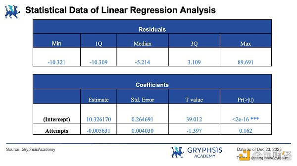 与此同时,线性回归结果表明,尝试次数的系数为 -0.0056 ,而 0.162 的 P 值也使得我们不能拒绝零假设,因此该结果也再次证明了中奖率和尝试次数之间并没有显著的线**。