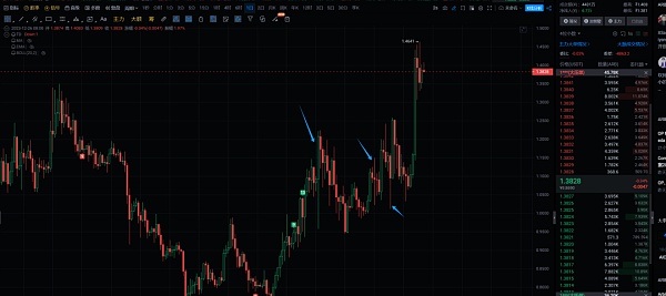ARB同样的道理,1.3刀以下可以分批布局,这个品种插针起来也是相当的**,所以,埋伏的区间1.1~1.3都可以,不是说**会到,只是按照自己之前操作这个项目的经验来看,下图三个插针式的下跌个人都有埋伏过仓位,都是短短几分钟,就博取了几千刀的收益,所以,真的不能太香,对于目前这么高的资金费率,我感觉狗庄插针清理多头仓位的概率非常的大,所以,目前有小伙伴如果是高倍杠杆参与的务必要带止损或者及时的获利出局!