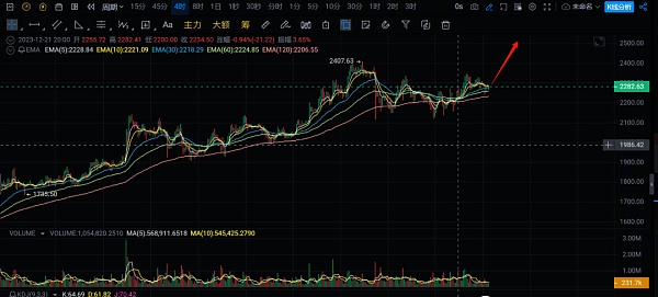 首先我们来分析一下大饼,btc目前报价43100,大方向暂时就先不去看,多头趋势,4小时级别来看的话,目前是暂时跌破MA30均线位置43400,MA120均线目前是短期我们做单的非常严格的支撑均线位置在42300,如果能站上MA30均线的话形态上会修复一下,多头方向就更大明确,量能上属于一般,短期看的话存在上冲新高的可能了,1小时线看,目前价格**跌破均线,属于短期的一个下降走势,但是值得注意的是昨晚跌破42500的时候,并没有放量跌稳,而是拉上来了,所以短期存在**的反弹,目前看均线位置能否站上去,站上去那么反弹力度也不会很弱。