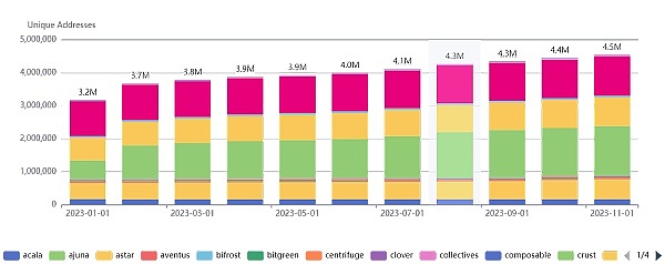 7、独立地址增长:2023年,独立地址数量增长了44%,从1月份的316.2万增加到11月的约454万,这表明波卡生态系统的用户和持有者数量在持续增加。