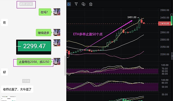 第2单:ETH在现价2299布局的多单,**到达止盈目标2350,**止盈50个点,恭喜,跟我布局的朋友获利满满!如图: