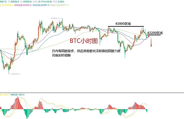 12月28日比特币(BTC)合约技术面分析:今日方面,大周期日线级别昨日报收中阳线,K线形态上单阴单阳,但价格在均线上方,附图指标死叉运行,而价格却是一直在高处横盘整理,旧居不下,这样的情况我们就要注意价格突然的上涨破高走势;短周期小时图昨日日内慢涨欧盘延续虽说没有破高,但价格没有承压回撤,晚间美盘延续还是没有破高,上方压力位置在43800区域附近,当前冲高承压回落,K线形态连阴,附图指标死叉运行,所以日内还是有回撤需求的,因此今日BTC短线合约交易策略:反抽43200区域空,止损43500区域,目标看42700-42500区域;