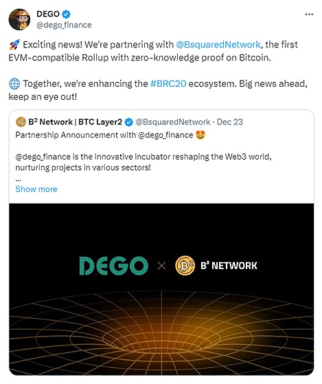 同样的套路,12月23日,dego finance 宣布将进军BRC20生态系统,25日发公告表示beta测试结束,准备开启BRC20项目发射,受一系列消息影响,dego仅在3日内币价直接涨超3倍。