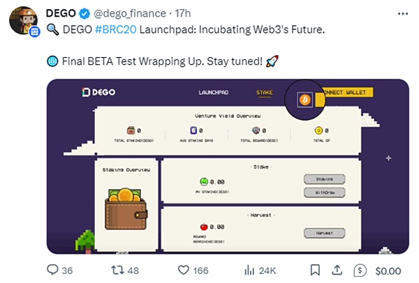 最近dego finance 的比特币brc20打新也要来了,曾经bsc上面的项目集体走打新发射路线。Dego目前是7000w美元市值,还没有合约,值得关注。