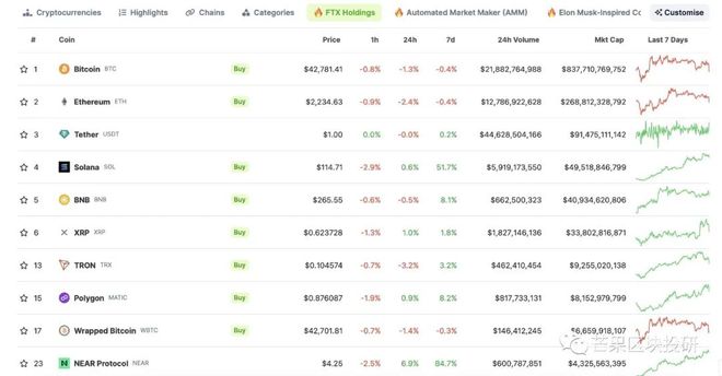 除了SOL之外,前十大币种今日大多略微上涨。比特币持续在4.3万至4.4万美元之间震荡,現报43910美元,近24小时涨幅1.2%。以太坊現报2,326美元,近24小时漲幅1.8%。BNB、XRP、ADA、DOGE和AVAX等其他主要加密货币也出现了不同程度的上涨。