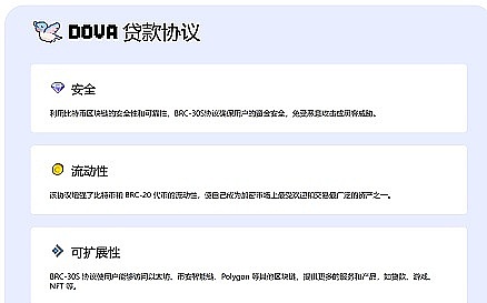 Dova Liquidity Protocol (DOVA),Dova协议是一种BRC-30S借贷协议,具有集成的 MultiBit桥,允许跨链无缝转移BRC-20**。用户可以使用以太坊上的Dova协议,用转移的**进行抵押**。 通过BRC-30S协议,用户可以访问以太坊、币安智能链、Polygon等,扩展借贷、游戏、NFT等服务。,DOVA价格:0.017美元市值:1100万美元 FDV:400万美元