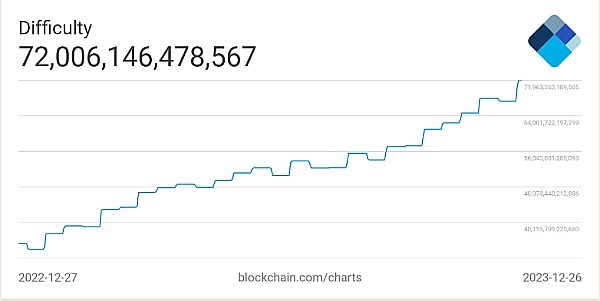 截至发稿,网络难度在72万亿左右,创下全年**点。根据Blockchain.com 的数据,截至 2023 年初,难度水平约为 34 万亿美元。