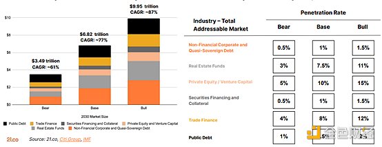 4、3.5-10万亿美元:预计到2030年,全球**化资产的市值规模将在熊市情况下的3.5万亿美元和牛市情况下的10万亿美元之间。该市场价值是根据各种资产类别的总可寻址市场的估计渗透率得出的。