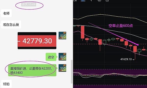 恭喜!行情暴跌,比特币在**点42779现价布局的空单,**到达止盈目标42200,止盈600点,恭喜,跟**作的朋友,如图: