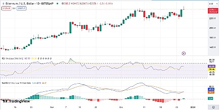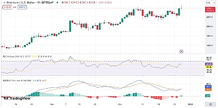以太坊 (ETH) 今天也大幅上涨,日涨幅达到 6%,截至发稿时交易价格为 2380 美元。以太坊目前的交易价格较之前 7 天的价格上涨 7.4%。截至 24 小时,交易量也飙升了 88%,达到 $17.9B。