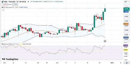 Arbitrum (ARB) 今天也是另一个上涨者,截至发稿时其日涨幅为 21.9%,交易价格为 1.58 美元。尽管价格上涨,Arbitrum 仍较之前 7 天的价格上涨 41%。过去 24 小时内交易量也增加了 213%,达到 $1.5B。