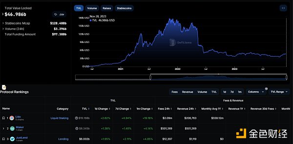2023年DeFi在总锁仓价值上呈现平稳态势,截止本文发布,有470亿美元的价值被锁定在DeFi合约中,较2022年12月31日的380亿美元上升了23.6%。