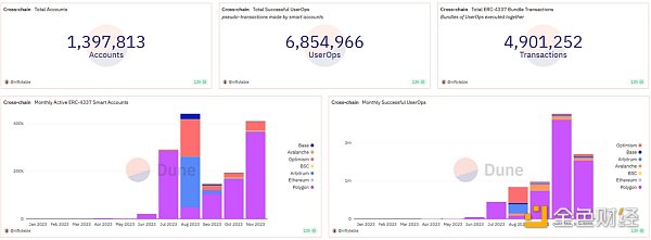 账户抽象的概念最早出现在2022年,随着 EIP-4337: Account Abstraction Using Alt Mempool的更新(一个**避免共识层协议更改的账户抽象提案,而是依赖于更高层级的基础设施),不少团队开始围绕账户抽象打造产品。 在终端产品上,目前的方向主要包括通过集成账户抽象实现了社交登录,社交恢复,代付gas,批量处理交易等功能的智能合约钱包, 在这面许多团队已经在2023年交付了产品,包括Argent、Avocado、Unipass等,他们在用户体验上都做出了很大的创新。 据Dune数据显示,目前全链已有接近140万个基于EIP-4337创建的账户,产生了接近700万次交易 (UserOps)。 截止本文发布,每月活跃的智能合约账户超过40万。