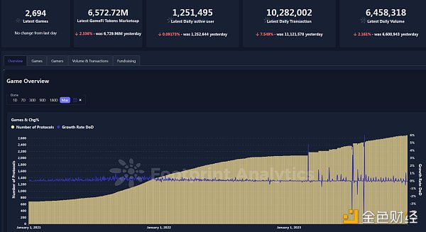 从下图数据来看,2023年游戏项目仍保持持续增长态势。 目前根据Footprint Analytics的项目数据统计(数据截止至2023年12月1日),当前市场链游合约数超2600个,已发币项目流通市值超65亿美元,单日交易量超6百万美元,日活地址数超1百万个, 整体的市场仍在熊市下保持了**的活跃度。