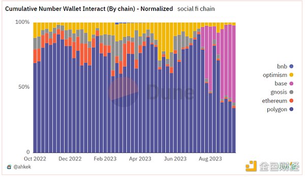 从特定链来看,目前主要的 SocialFi 项目交互集中在Polygon和Base两条链上,其他链目前在社交领域收获流量较少。 除了提供稳定的网络、快速的运算速度和低廉的交互费用外,Polygon在过去的1-2年的时间内积极发展生态内的各项游戏、NFT等应用类项目, 同时拓展受众群,与Web2大IP机构合作,收获了来自加密领域内外的大量流量,在整个 SocialFi 赛道方面呈现出持续稳定的流量增长。 Base得益于Friend.Tech所带来的大量流量,目前占据了 SocialFi 赛道流量的半壁江山。 其他链如Ethereum和BNB等社区相关的流量增长相对比较**。