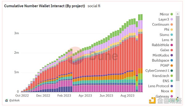 从2021年开始,SocialFi 这一赛道逐步进入加密领域用户的视野, 与链游的社交和娱乐属性相似,被认为是可以带来大量Web3新用户流量的现象级赛道。 相比2021-2022整个赛道较为冷淡的处境,2023年 SocialFi 赛道的一些玩法和设计上的创新获得了不小的流量。 如下图所示,整个 SocialFi 赛道在过去一年迎来了较好的发展,主流项目的累计钱包交互数接近400万次以上,而Galxe、Friend.Tech、Si**o等新项目也收获了不少流量。