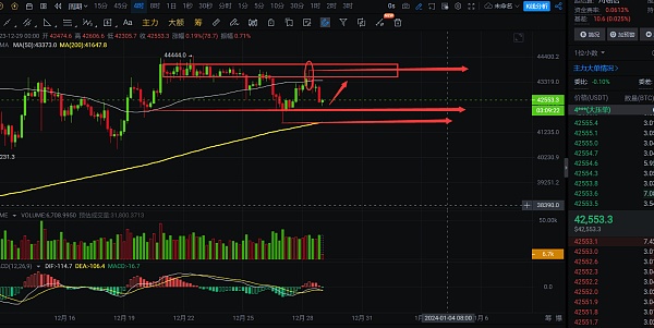 4小时线上看,大饼昨晚的反弹刚好到达预期点位43850附近,上方压力区间有效,短线在压力附近收长上影线,下跌也就接踵而至,这波下跌是到达了预测区间42470-42100,到达这个区间空单就可离场,晚间多单不着急去做布局,大饼强支撑在42100附近,下方关注低点41619位置,不跌破该位置,行情在42100附近见到下影线就可做多单的布局,短线反弹目标区间在43150-43450,到达后减仓看高点43830突破,如成功突破,那大饼也将突破短线压力区间,到达下一压力44680附近,自行把握进场机会;短线交易,控制风险,盈亏自理;
