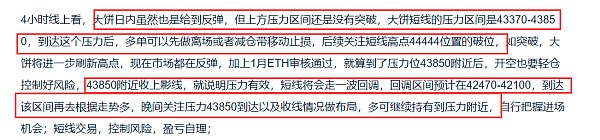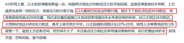大饼昨晚如预期反弹到43850压力附近,并未突破,白盘收针,大饼**点位在43830,昨晚已经提示大家在43850附近收上影线可空,目标在42470-42100,晚间下跌低点在42305位置,已经到达目标区间了,短线空单可做离场;以太昨晚我们提示反弹点位预计在2435附近,昨日以太走势有点强,**拉升点位在2451,随后收长上影线到2435下方,刚好大饼也在43850附近收针,基本同步,短线空单目前有几十点利润,虽然下跌没有大饼猛,没有到达目标2275-2235区间,但短线利润还是有的,恭喜跟上这波短线回调的朋友小赚一波,晚间关注短线支撑再做布局;