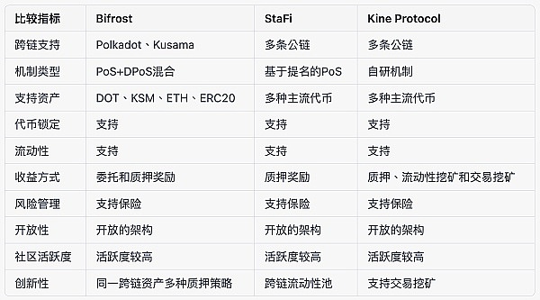 在整个公链生态 DeFi 发展方面,Staking 衍生品为生态带来了 DeFi 收益率优势。如果 Layer1 生态未来都采用衍生品来实现 DeFi,那么在不考虑项目补贴的情况下,基础的 Staking 收益率结合 Staking 衍生品的 DeFi 收益率会高于普通 DeFi 收益率。例如,以太坊头部 DeFi 项目目前长期稳定收益率能超过 5% 就很不错了。但是,如果将 DeFi 与 Staking 衍生品结合起来,5% 的利息加上 15% 的 Staking 收益,这个 DeFi 产品就会有 20% 长期稳定的年化收益,从而吸引更多用户来到生态中。目前主流的跨链质押协议包括: