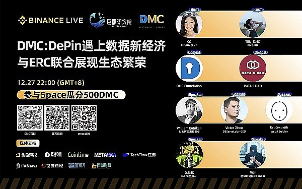 在本次AMA中,DMC与DATA S DAO一起荣幸地邀请到了 D3ServeLabs的CEO周载南Victor Zhou、以太坊杰出贡献者William Entriken、LX DAO founder Bruce 、D.one founder叁亿、巨鲸研究院founder靖沣五位嘉宾共同讨论DePIN将在数据新经济时代如何与ERC生态共同繁荣。