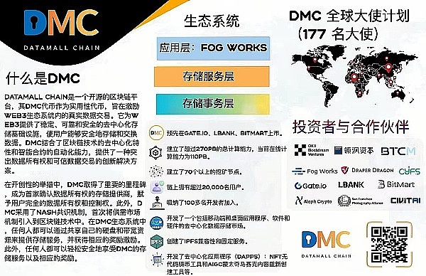 DMC是一个基于Nash- Consensus存储合约的去**化存 诸网络,为用户提供安全、**、 可认证的去**化存储服务。旨在 推动下一代互联网基础设施和 DePIN物联网区块链技术的发展, 专注于构建多公链生态中的Web3 底层存储架构。