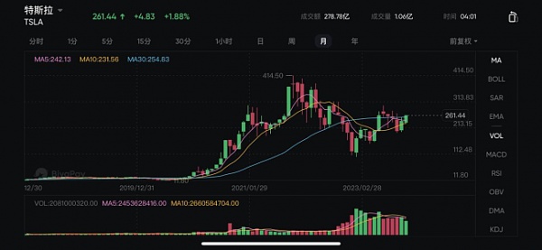 特斯拉公司成立于2003年,它的月线走势图如下。