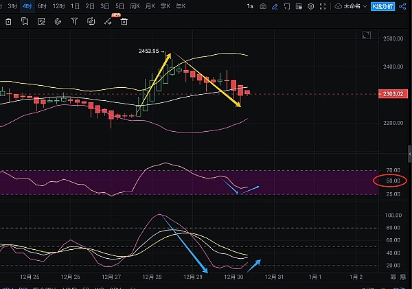 这里看下今天12.30年度**一天ETH日线级别走势,K线当前在布林带中上轨间呈现出箱体震荡格局,冲高回落后的一个震荡下行的延续。那么日线大级别走势的上方压力位也就是箱体上沿2340附近,今天盘中**反弹可能也**于此点位2340