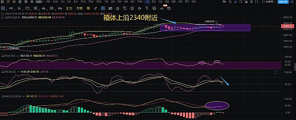 买卖强弱RSI指标趋势线反复在70值区间震荡反转,当前趋势指向相仿50值,多头也由盛转衰日间关注下方2260附近中轨可能面临二次回踩风险,短线**追多的仓位可以逢高建仓或出局。KDJ当钱J先下穿K,D周期线,一个下降趋势指向。MACD指标快慢线双线粘连,走势上有横盘整理需求,多,空角力有所平衡。进一步打开行情后大的震荡区间可能会在上方2340--下方2260范围