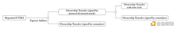 协议或委员会账户专门处理所有“充值”到Layer2的UTXO资产的“转移”权限。只有协议、可信预言机或委员会账户可以更改存入UTXO的所有权。可信预言机确保所有权转移交易中包含正确的输出UTXO脚本。