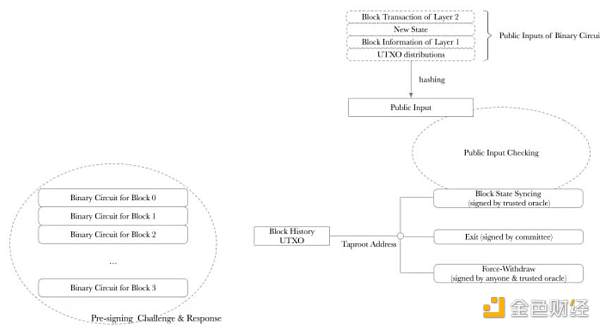为了处理这两个缺点,对于Layer2的每个区块,创建一个**的二进制电路,并且固定“公共输入”。比特币脚本用于处理公共输入的哈希和检查。正确的公共输入比特承诺由可信的预言机进行检查。就电路满足性而言,委员会内的**成员都有权利提出挑战。