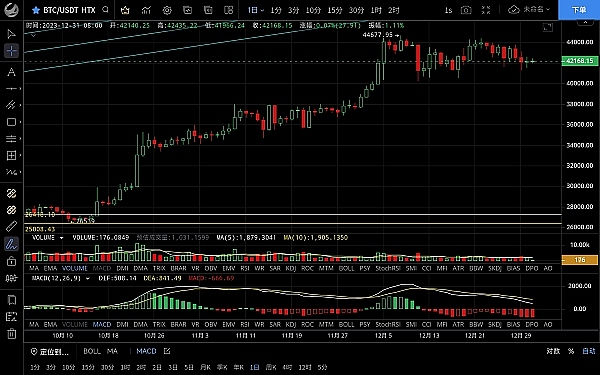 大饼昨日早间**跌至41260一线支撑反弹,期间二次回落未破前低,行情一路上行**触及42600附近承压回落,恭喜跟上低多思路的朋友获利1000点,目前币价在42110附近运行,四小时级别行情多次下打ma200均线都未有效跌破走出反弹,上方整体承压于ma30下方,短期k线连阴下跌,活动空间逐渐变窄,macd无量运行双线粘合,周末波动不大预计会持续窄幅震荡,日线级别整体呈震荡走势,高点逐步**,macd呈空头死叉状态,短线偏向空头,但下方支撑较为强劲,加上年末变数较大,且记带好止损,目前思路建议高空低多对待,上方压制42500-43000,下方支撑41500-41000