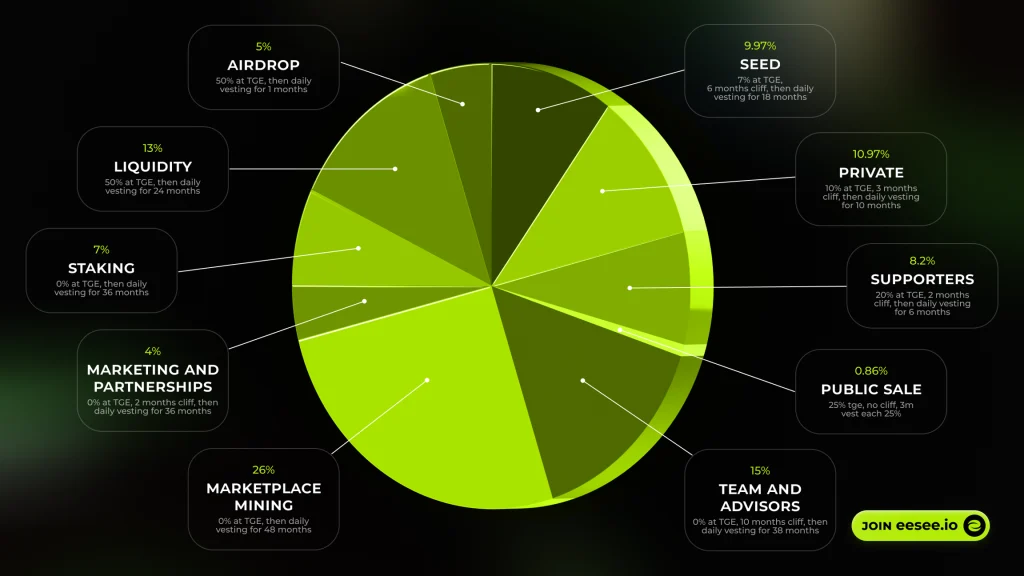 - 市场挖矿:26% 。分配给eesee平台用户的**。为平台做出贡献的用户将始终获得eesee**作为奖励机制的加班奖励。解锁时间表为0% **E、0 个月悬崖期、48 个月的线性归属。