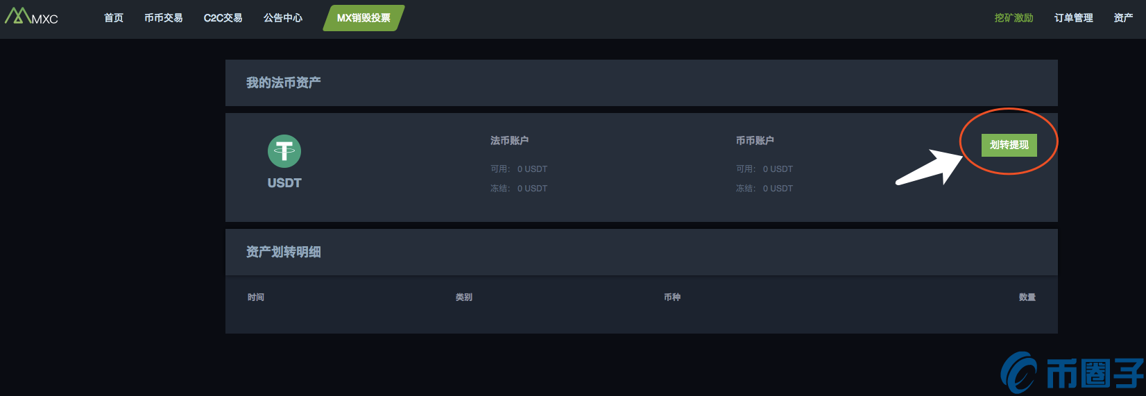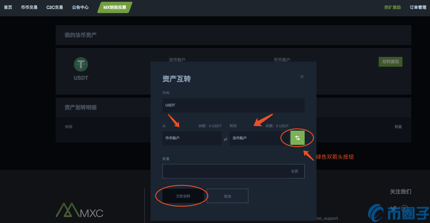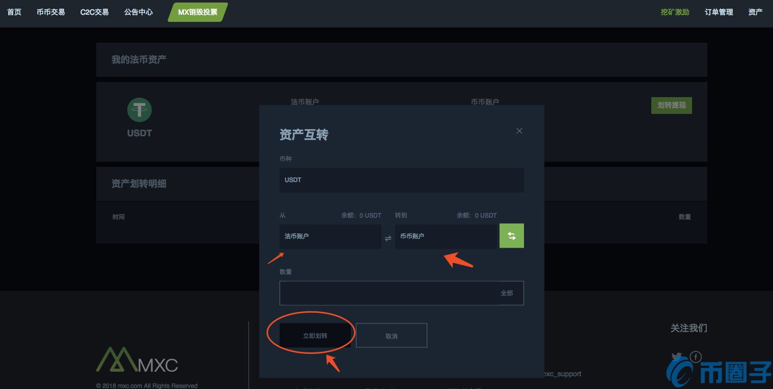 七、 资金划转。当您购买USDT完成后,想要使用USDT来购买其他数字货币时(例如:比特币BTC,以太坊ETH,抹茶MX),需要将您购得的USDT从“法币账户”划转到“币币账户”,划转完成后您才能在“币币交易”页面进行交易。具体方法如下: