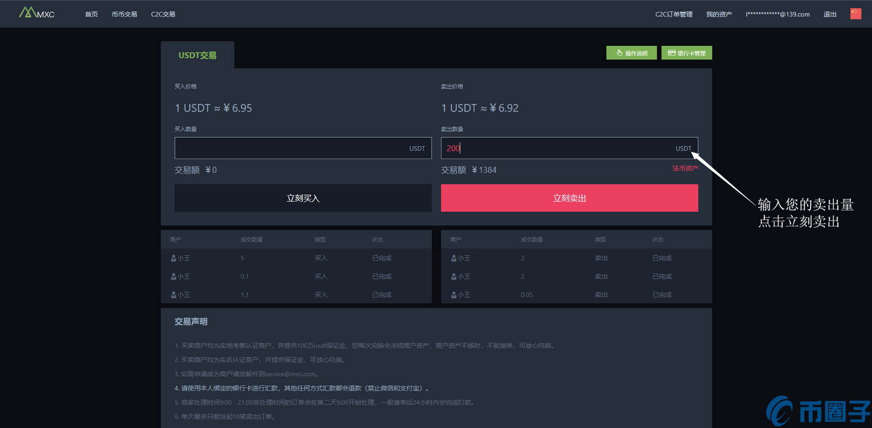 4、 请您此点击左上角的C2C交易后,请在USDT交易输入您的卖出数量,然后点击立刻卖出,完成卖出。