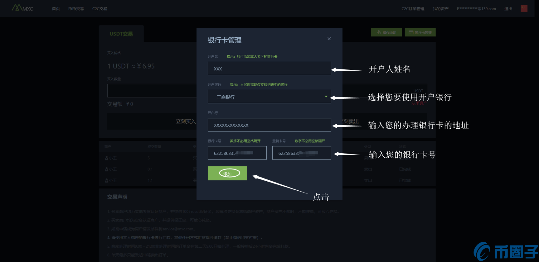 五、 添加银行卡:请输入您的银行卡开户人姓名-请选择您要使用开户银行-请您输入您的办理银行的地址-请输入您的银行卡号,并重复输入一次您的银行卡号-**点击添加。