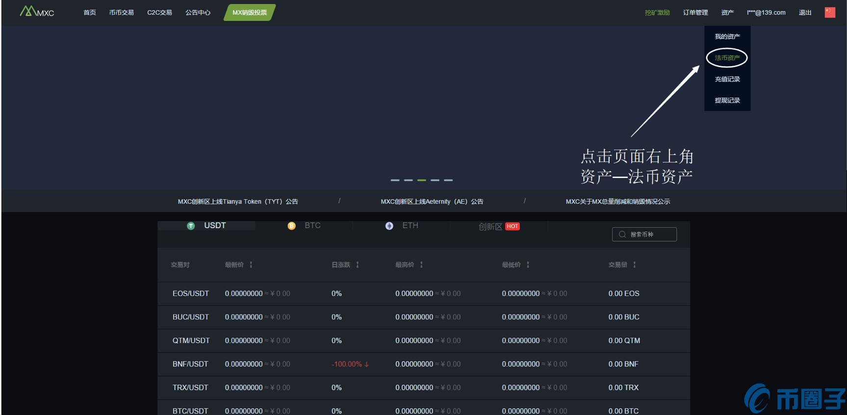 1、回到首页点击页面右上角-“资产”,然后选择'法币资产"按钮,进入发“法币资产”到页面。