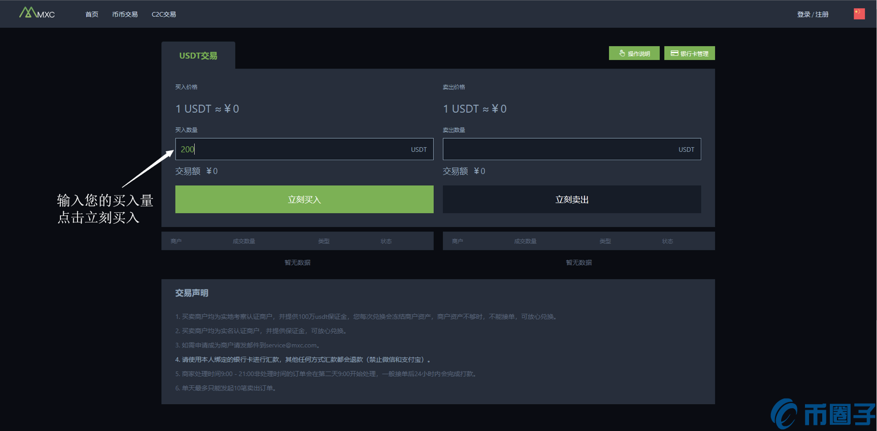 六、用法币购买USDT:请您此点击左上角的C2C交易后,在USDT交易输入您的买入数量,然后点击立刻买入,完成购买。