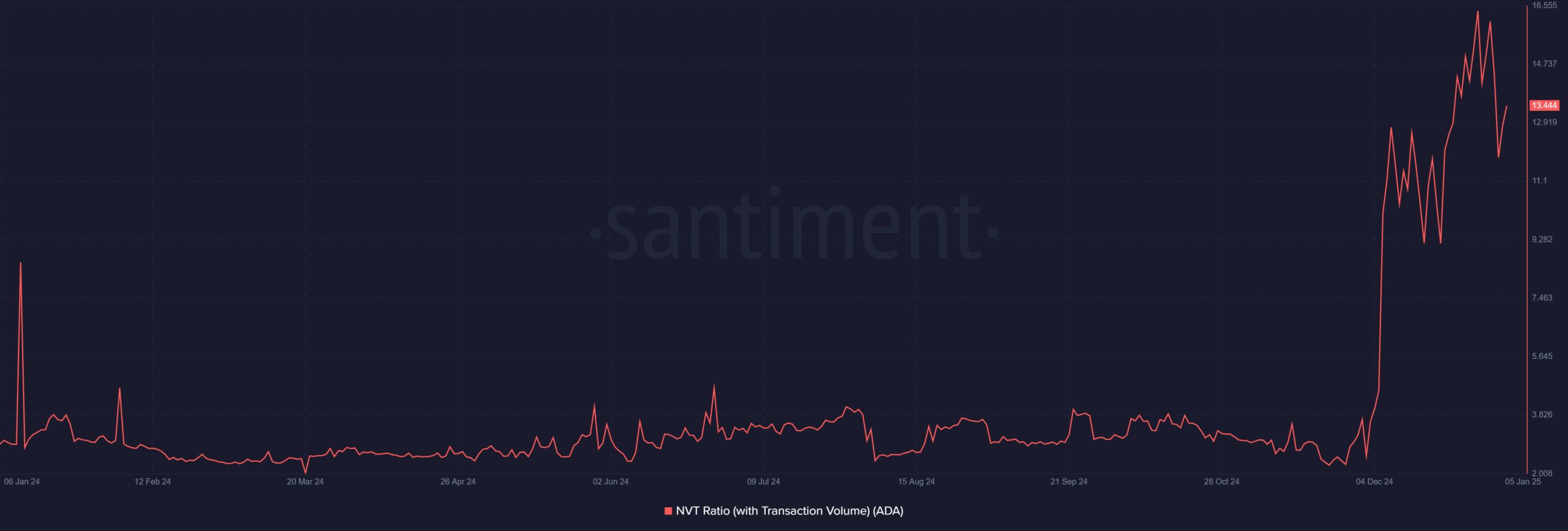 Cardano 的 NVT(网络价值与交易)比率表明,交易量相对于其市值稳步上升。这一增长表明,ADA 的估值得到了强大的网络效用的支持。