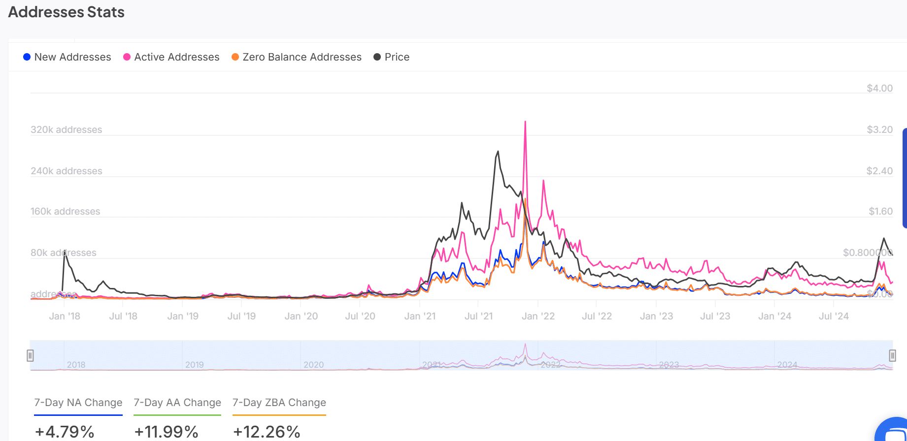 Cardano 的网络活动反映出投资者和用户重新燃起的兴趣。过去一周,新地址增加了 4.79%,活跃地址更是大幅增加了 11.99%。
