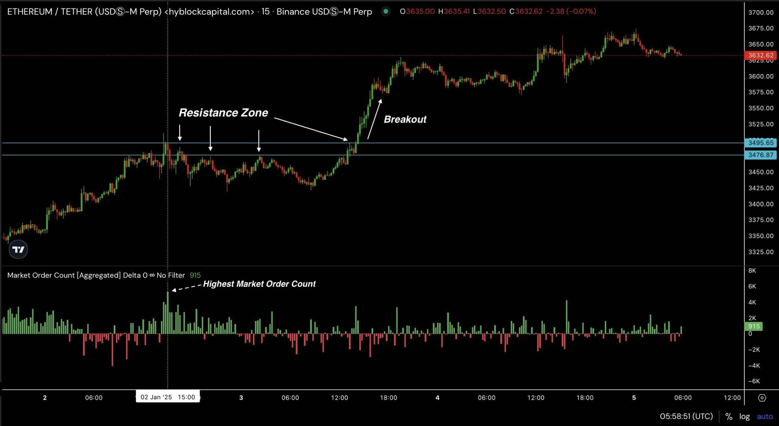 进一步分析显示,ETH 已从阻力区突破,该阻力区之前由 3,650 美元左右的高市场订单量确定。阻力位经过多次测试,交易量达到峰值。