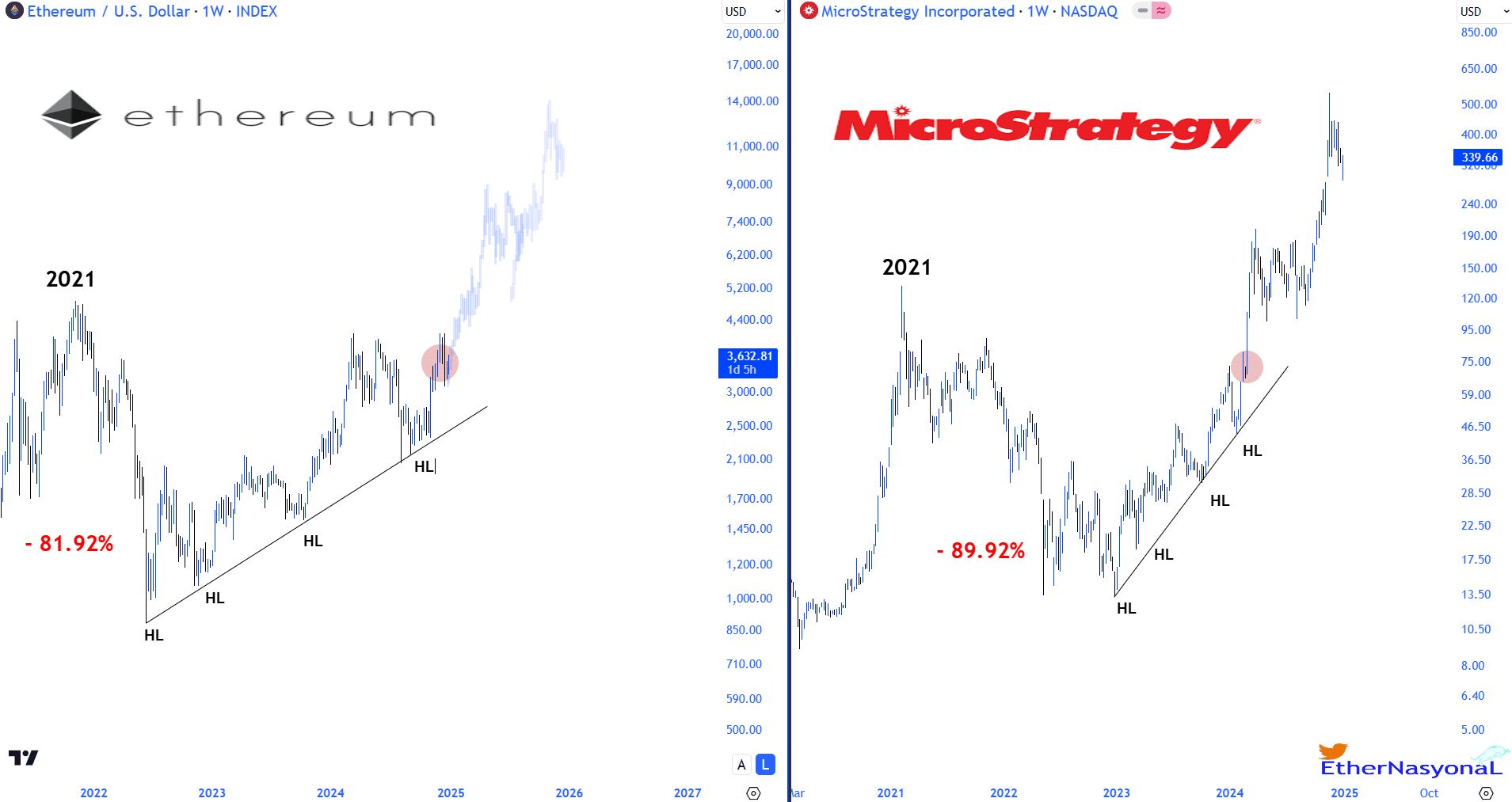 2021 年,ETH 下跌了 81.92%,与 MicroStrategy 同期的 89.92% 的跌幅如出一辙。不过,两张图表都显示出复苏阶段,低点走高表明投资者信心增强。