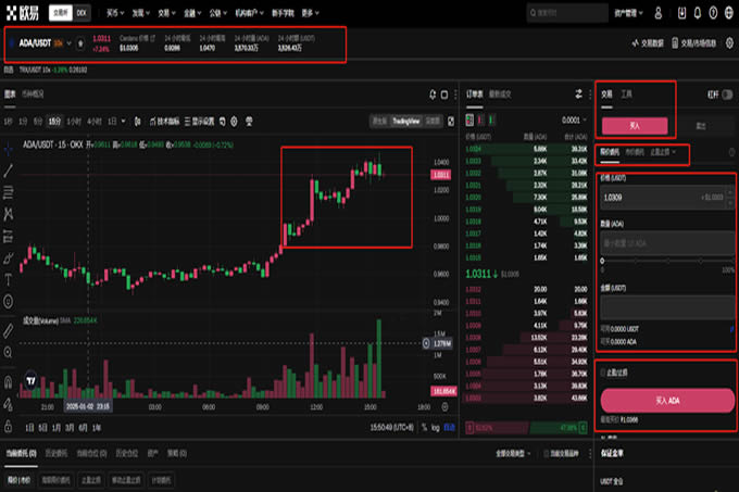 查看币对信息:在交易币对的右侧页面,您可以查看ADA的涨跌幅、成交价格和成交量等信息。同时,您还可以查看K线图并调节各种参数。