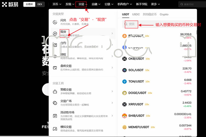 进入买币页面:在交易所的左上角,点击【交易】选项,然后选择【现货】。