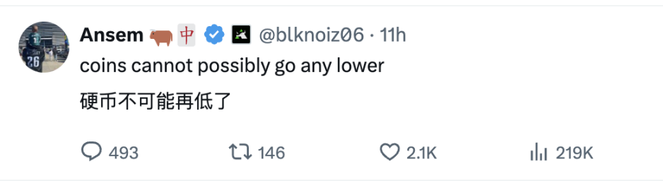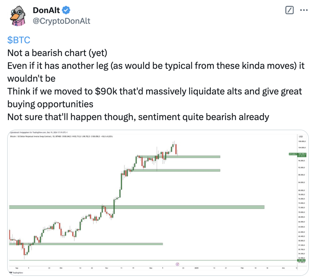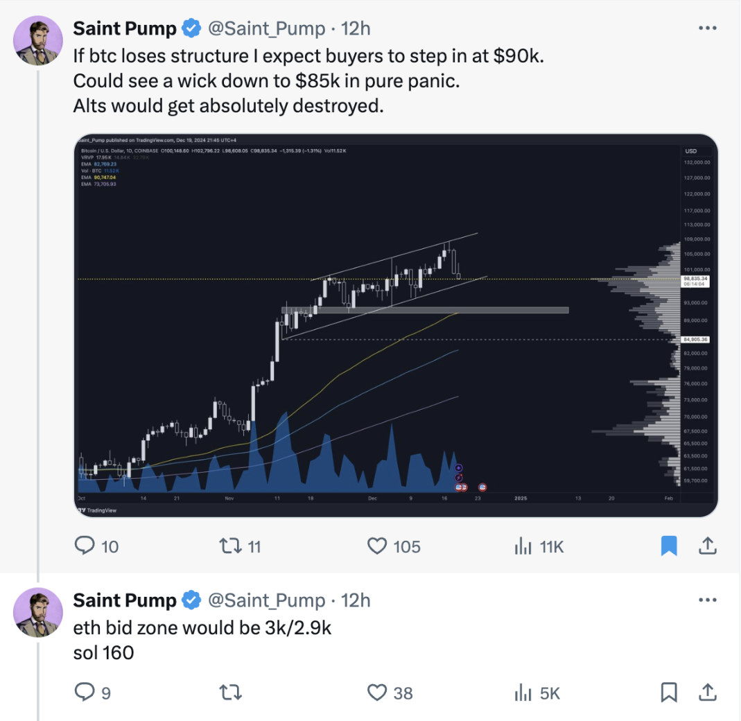 如果比特币结构跌破,我预测买盘会在 90000 时再次出现。在纯粹的恐慌中可能一路跌至 85000 美元。山寨币则会**崩盘。