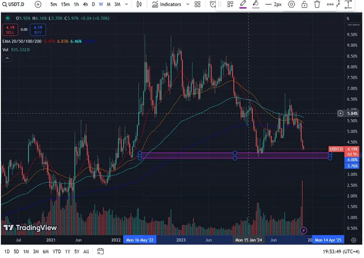 一般来说,当 USDT.D 下降时,人们会卖出 USDT 来购买加密货币,无论是比特币还是山寨。在困难时期,人们会涌向比特币,但会在比特币季购买(记住 BTC.D),因为比特币的价格会上涨。但如果你看到 USDT.D 下降而山寨价格上涨,那么流动性将更多地流向山寨而不是比特币。