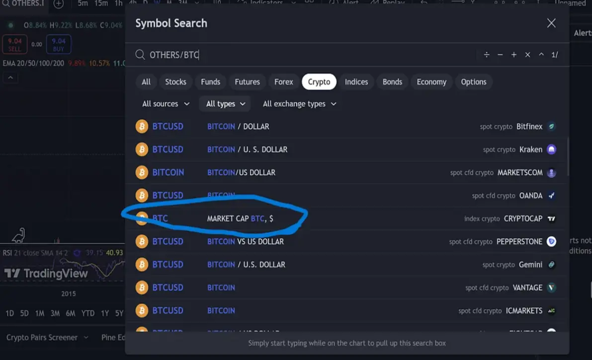 我们谈论了 OTHERS,即除了蓝筹股之外的所有山寨。一个更好的图表是查看这些山寨(OTHERS)相对于比特币的表现。要在 Tradingview 上获取这个图表,只需打开搜索栏,输入 OTHERS/BTC,如图片所示。然后查找标记的指标并点击它。
