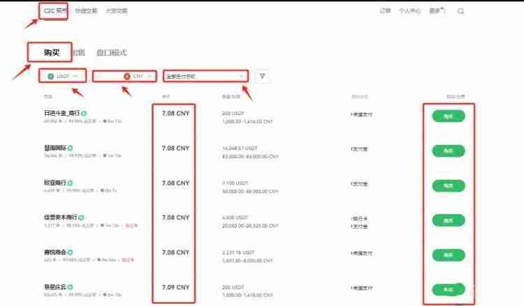 9、进行交易前需要拥有USDT,可在C2C买币进行交易,根据需求选择合适商家,点击“购买”,而后根据提示进行付款、等待商家放币(若是长时间没有收到币种,可联系客服进行处理)