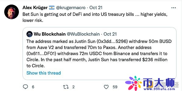 10月23日消息,据加密货币分析师兼经济学家Alex Krüger在社交媒体上表示,他猜测 Justin Sun 正在退出 DeFi 并将资本转向投资美国政府债券,因为美国政府债券有更高的收益率和更低的风险。