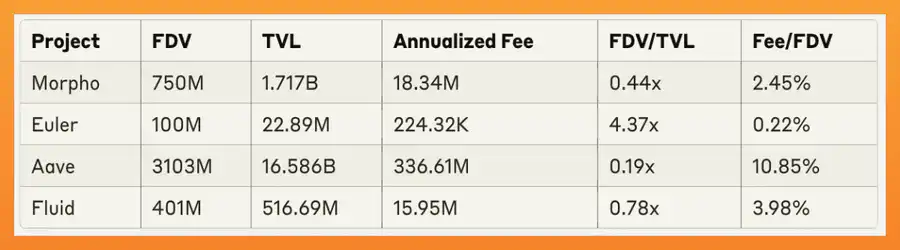 Fluid 通过借贷协议每年创收约 1595 万美元,其费用 /FDV 比为 3.98%,与 Morpho 和 Euler 等新兴借贷协议相比具有竞争力。随着即将推出的 DEX,其收入有望进一步增加: